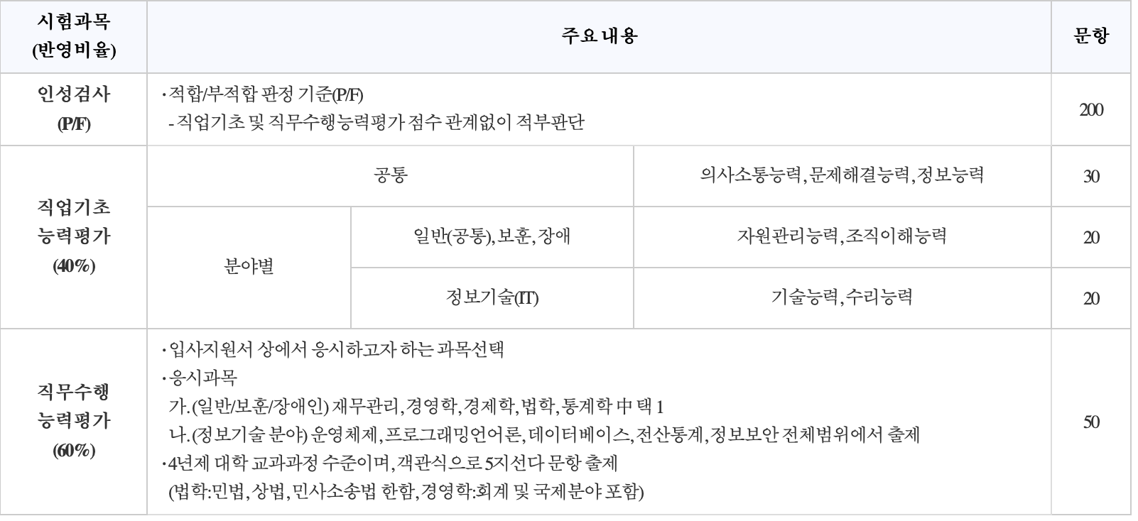 · 필기전형 가. 인성검사, 직업기초능력평가, 직무수행능력평가로 구성 |