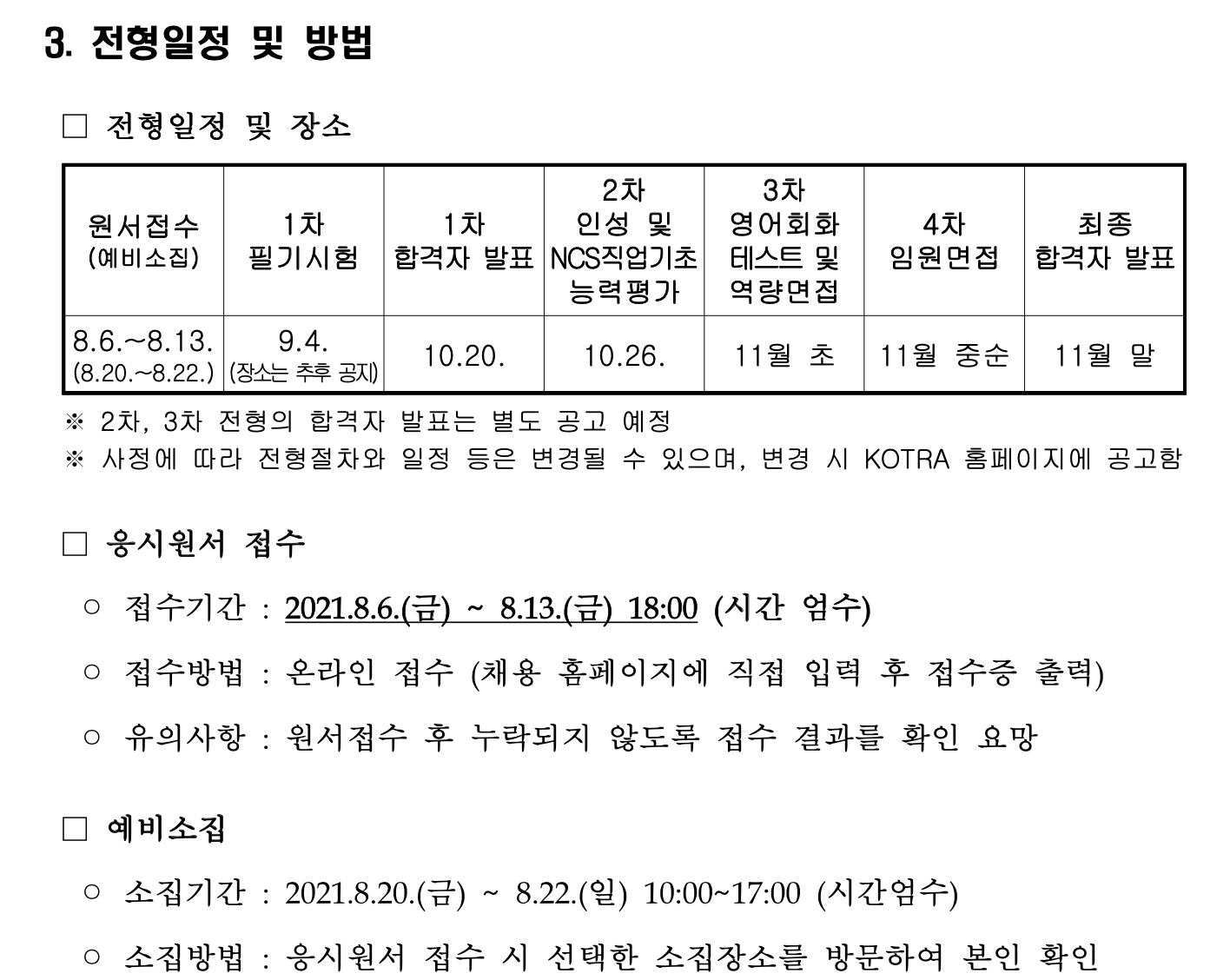 - 코로나19와 관련하여 각 전형 과정에서 전형 당일 시점을 기준으로 확진자 및 자가격리자는 전형 참가가 제한될 수 있으며, 기관의 방역 조치에 적극 협조하여 주시기 바랍니다. (기타 자세한 사항은 추후 별도 공지 예정)
