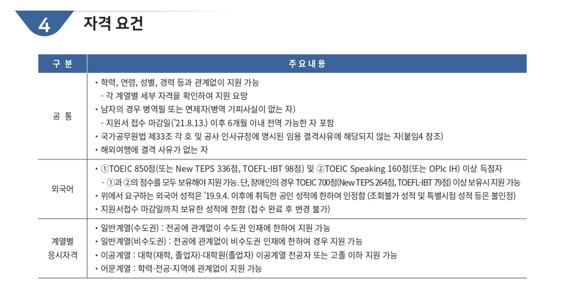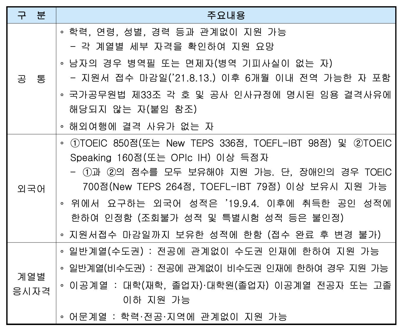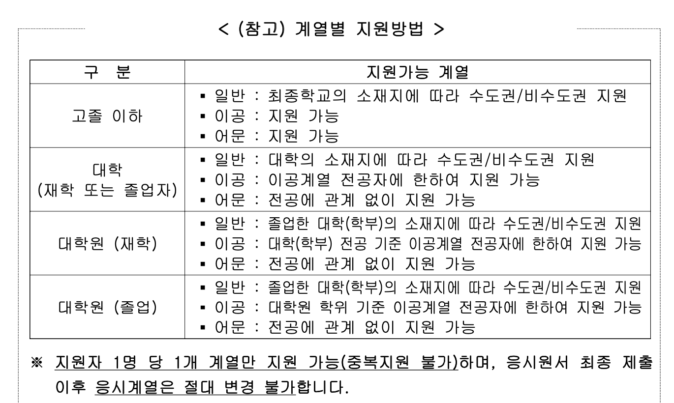 주3) 이공계열은 대학(재학, 졸업자)·대학원(졸업자) 이공계열 전공자 또는 고졸 이하인 경우 지원 가능하며, 지원 기준에 맞지 않는 것으로 판별될 경우 불합격 처리 예정임