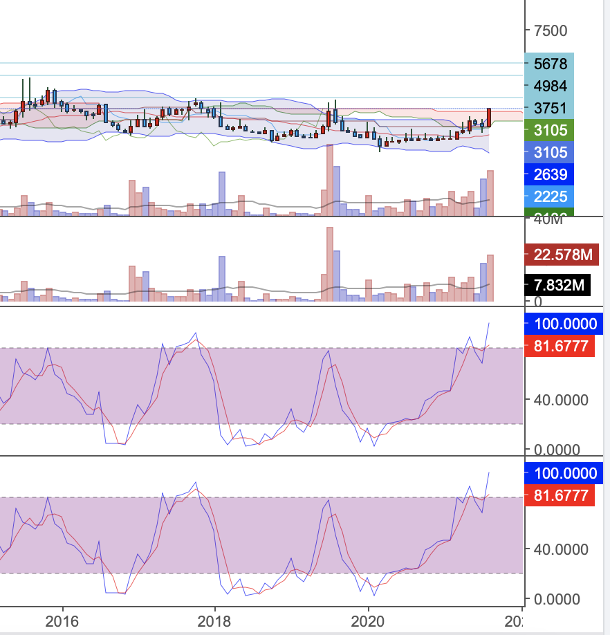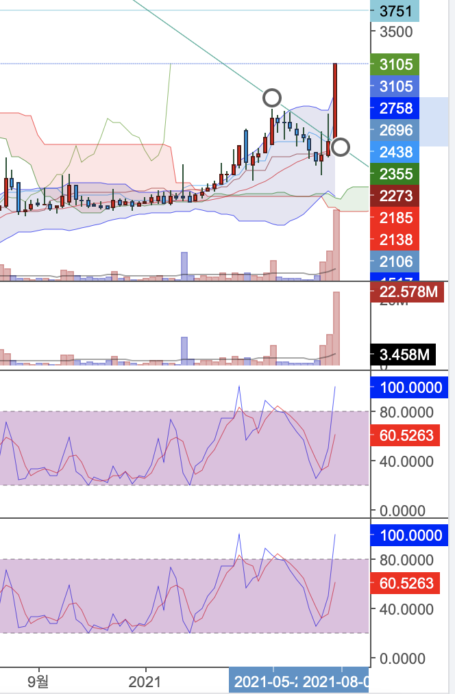 갤럭시아에스엠 주가는 3750, 4980, 5670원을 저항선으로 두고 있다. 왼쪽 월봉에서 보면 이슈가 있던 19-20년에도 거의 박스권에 가까운 움직임이었다. 저 세구간의 저항선을 연달아 넘어서면 몇 년간 있던 움직임 중 큰 방향성이 나오지 않을까 생각된다. 왼쪽의 주봉에서는 하락추세선 돌파 이후가 매매타점으로 보이고 추세가 지속되는 지표를 보여준다.