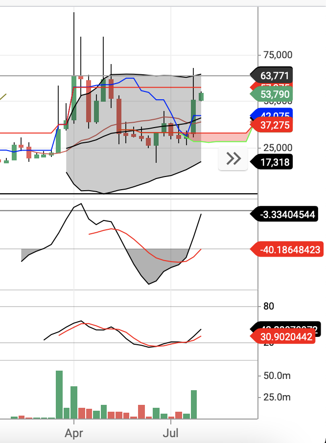 기존 코인들과는 확연하게 다른 움직임이다. 가장왼쪽은 주봉으로 63700(Bb상단)을 목표하는 단기트레이더가 많다. 일봉에서는 양음양 형태를 기대할 수 있는데 우선 오른쪽의 네시간 차트에서 하락추세선 돌파가 먼저이다. 네시간봉 하락추세선 돌파 시 -> 일봉에서 양음양(직전하락 장악) -> BB상단 돌파의 시나리오가 상승에 제일 좋은 시나리오이다.