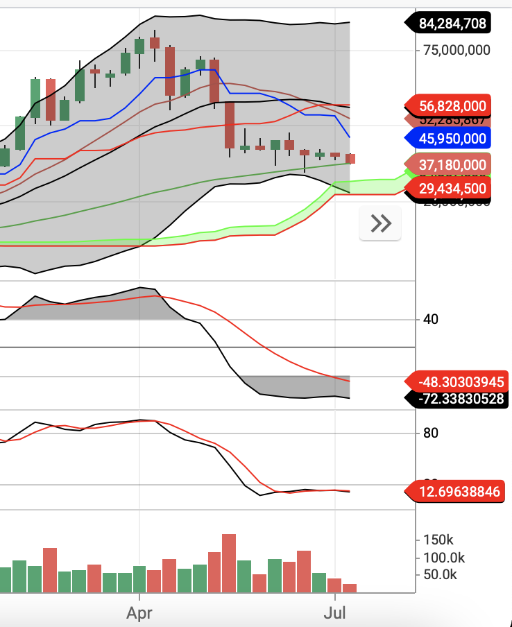 비트코인 그래프는 7.17일 현재 좋은 상황이 아니다. 주봉 하단에서 오래 머무르면서 지표를 소화해야했지만 오를 타이밍에 오르지 못했고 결국 하락추세 전환을 실패하는 모양으로 가고 있다.