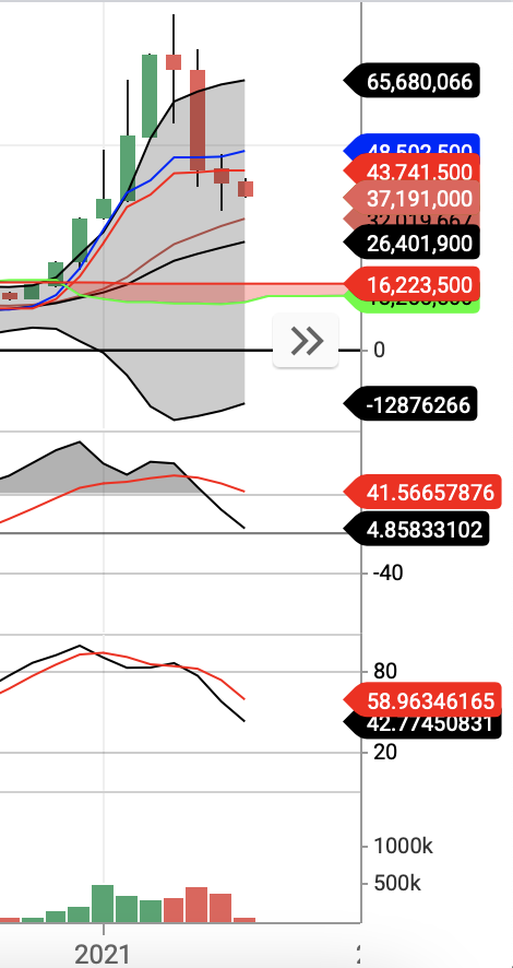 비트코인 시세에서 가장 오른쪽 그래프가 제일 중요하다. 일봉 그래프이고 하락삼각형 형태로 하방압박을 다시 받고 있는데 이 구간에서 여러번 도전을 받으면 다음은 장대음봉을 주의해야한다. 가운데 그래프인 주봉에서는 추세전환 실패가 나오고 있다. 상승추세로의 전환 실패이기 때문에 밴드 하단까지도 충분히 열려 있는 상황이고 지금은 굳이 단타를 한다면 빨간선(지지라인)에 닿을 때 매수하고 반등을 노리는 것을 목표로 하면 되지만 손익비가 좋은 상황은 아니다.