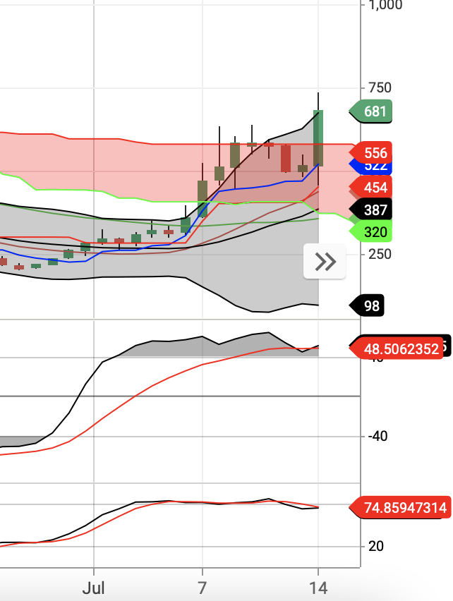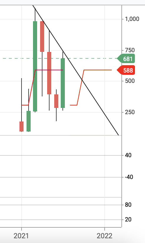 샌드박스의 왼쪽 월봉추세선은 저항구간이자 어제 터치했던 750원이 저항라인이다. 옆의 주봉은 밑꼬리를 만들고 상승해줘서 봉의 형태가 좋은 편이다.