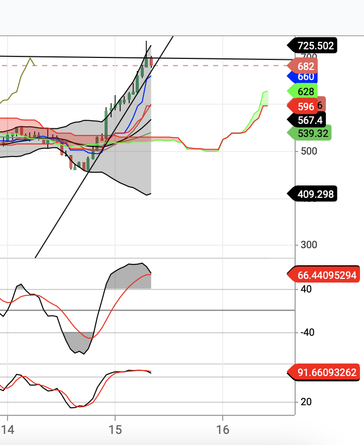 4시간봉에서는 조정을 어느정도 마무리하고 오전 9시이후 다시 정배열을 시도하는 그림이다. 다만 1시간봉에서 오른쪽 사진처럼 가파른 상승추세와 지표가 데드크로스 나는 점을 조심해야 할 것이다.