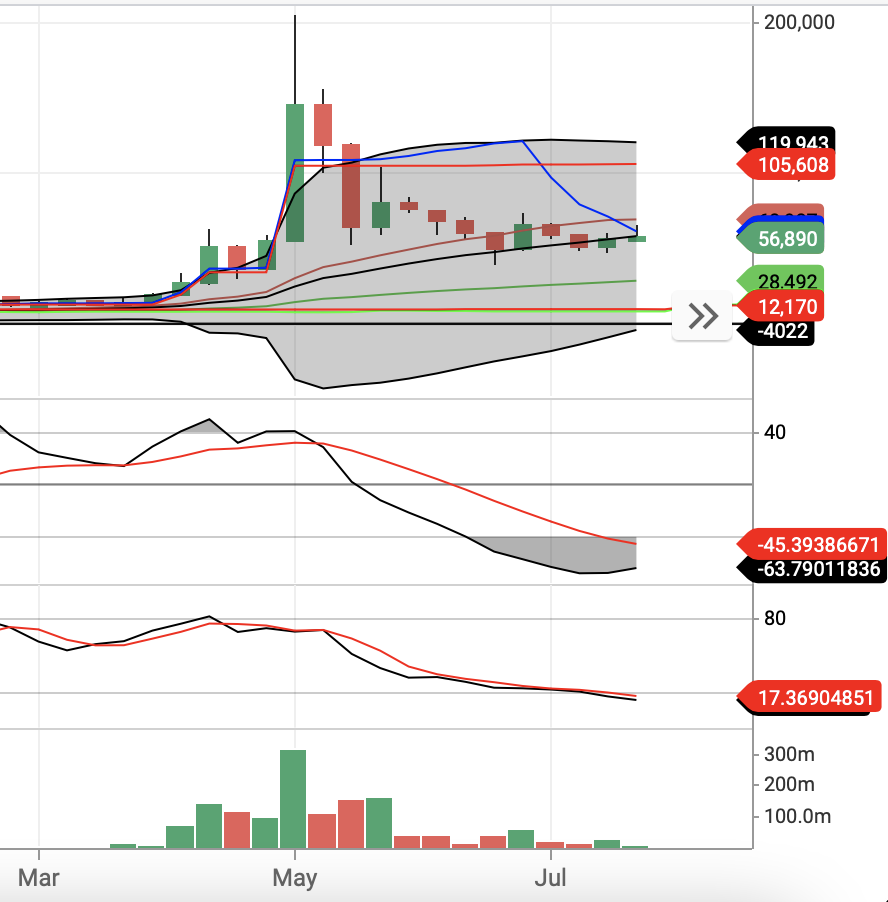 월봉과 주봉은 다른 코인들의 시세와 크게 다르지 않다. 가격이 밴드타고 되돌림 진행중이었고 주봉에서는 다시 상승사이클을 노리고 있었다. 어제 횡보만 해줬어도 더 좋았을텐데 현재 긴 윗꼬리를 만들고 일봉을 마감하려 하고 있다. 음봉마감은 제일 안좋은 형태지만 음봉 역망치까지는 아닌상황. 어쨌든 저항구간은 한번에 돌파가 어려운 상황이다.