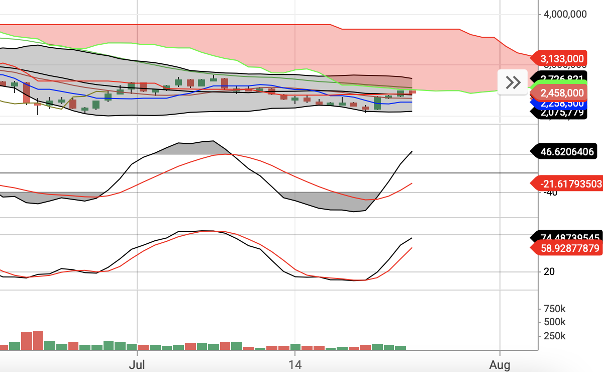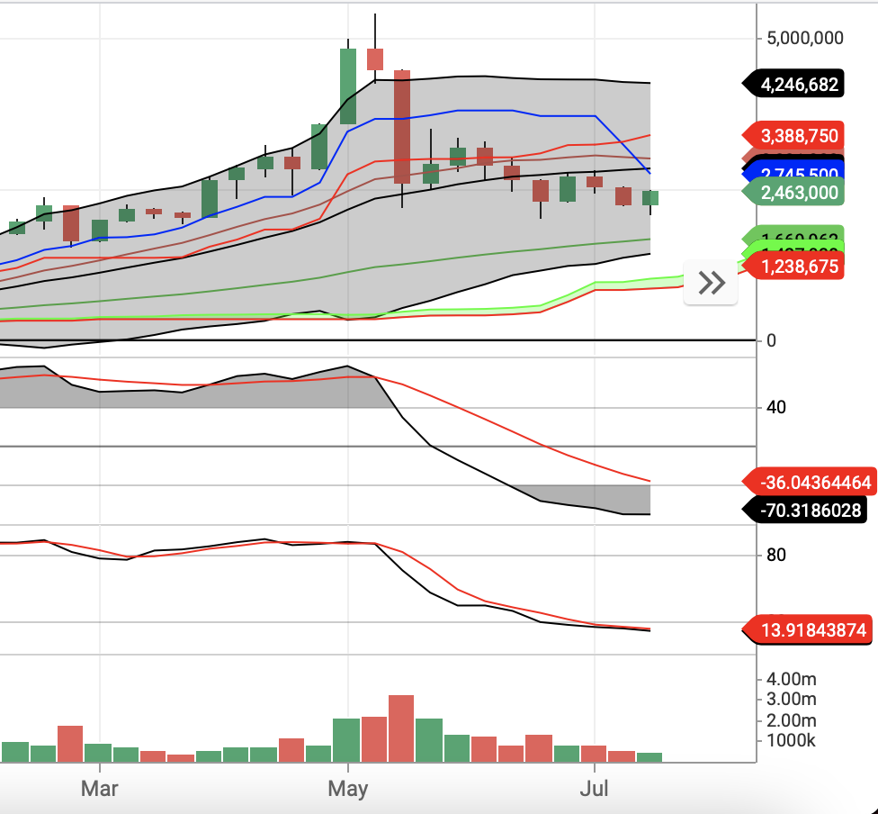 스텔라루멘 시세가 전일보다 10% 상승했다. 상승폭이 형제코인에 비해 좋은 편이고 빠르게 BB상단에 도달해있다. 주봉의 형상은 다른 메이저알트코인에 비해 좋아졌다. 이제 곧 주말이 다가오