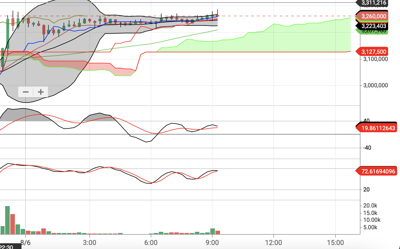 월봉 시세는 현재 시총 20위권 내 알트코인중 제일 좋다. 타고 올라가는 흐름이라고 볼 수 있고 짧은봉에서는 이런 경우 밴드를 타고 올라가거나 잡코인은 장대양봉으로 올라간다. 그런 흐름이 월봉에서 보이고 있다. 주봉은 스토캐스틱과 smi 모두 추세전환FAILURE로 상승추세의 지속을 나타낸다. 월봉과 주봉은 모두 좋은 흐름을 보이고 있다.