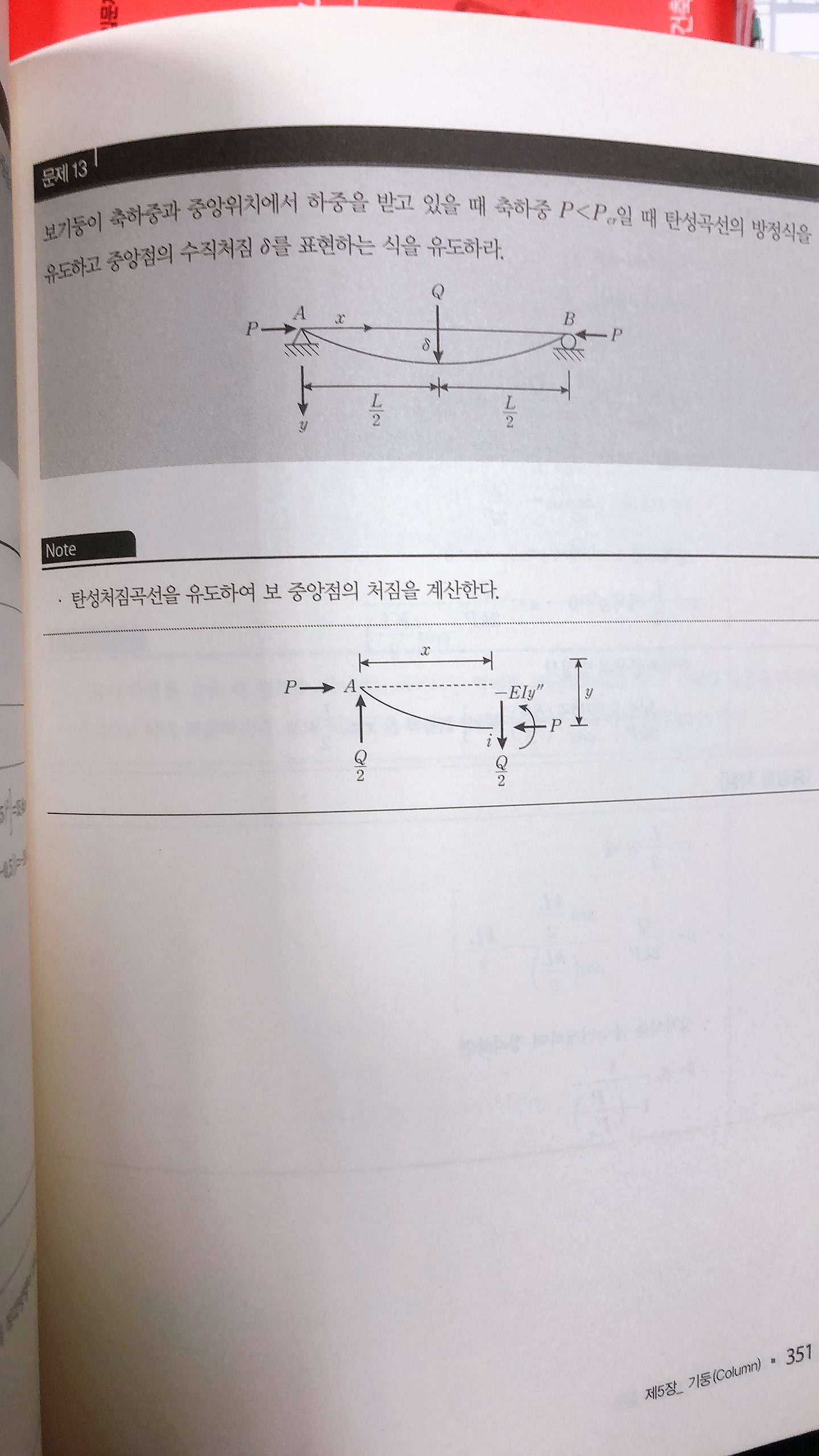 토목구조기술사 125회의 마지막 문제이다. 4-6번은 기둥 부재로 놓고 구조해석을 해야하며 자유물체도를 그린 뒤 Yp를 계산기에 입력하고 경계조건인 처짐0, 중간지점에서 처짐에 관한 식을 정리한다. 그 다음 중간지점에 대해 값을 집어넣어 구하는데 이 문제는 특정 교재에 있는 문제와 똑같았다.